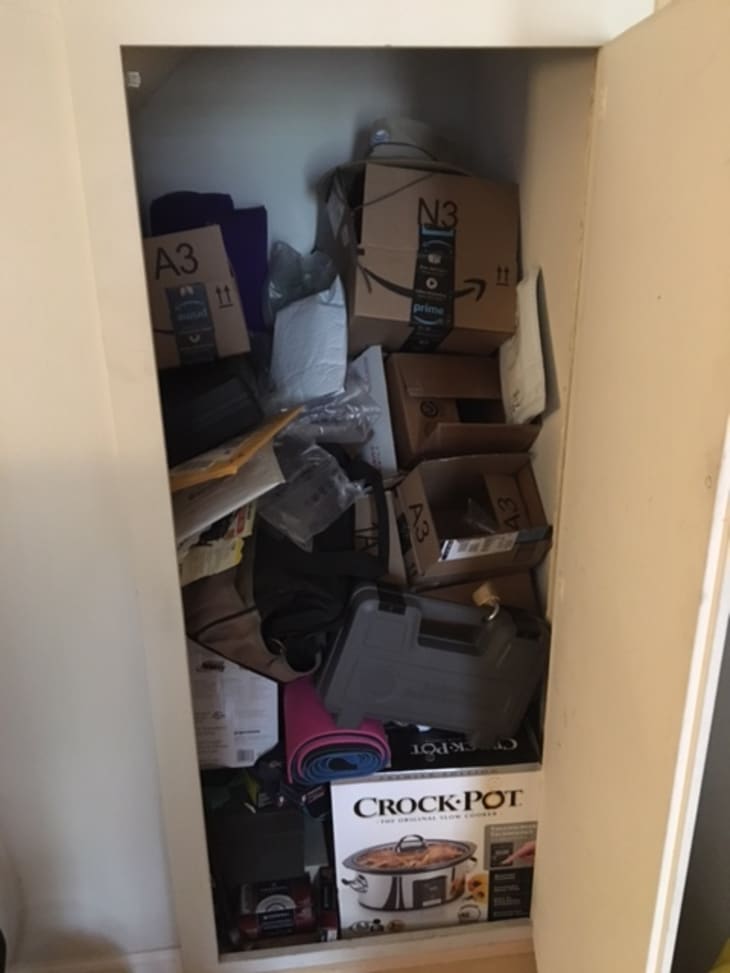 All of the sudden our grocery stores were out of items we'd always taken for granted. Throw away (by far the biggest pile) find another place in the house So, let's see what we can do. Organize that closet under the stairs. To maximize the space under the stairs, we started by pulling everything out from under the stairs.